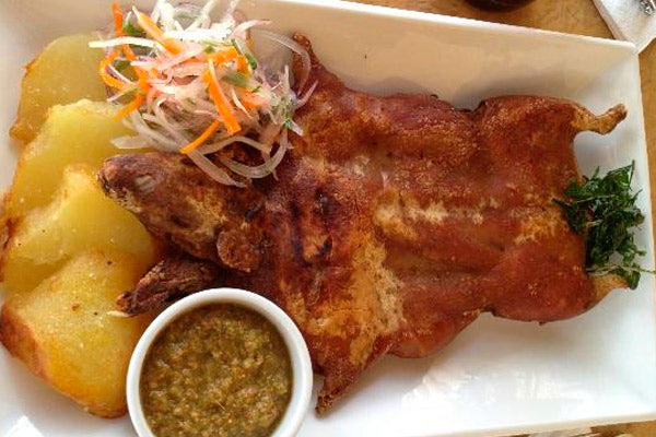 Plato tradicional en la cocina ecuatoriana, especialmente en la sierra. Se prepara asado o frito, sazonado con hierbas y especias, y se sirve con papas, maíz o mote. Su sabor es único, similar al conejo, y es valorado por su textura crujiente y jugosa.